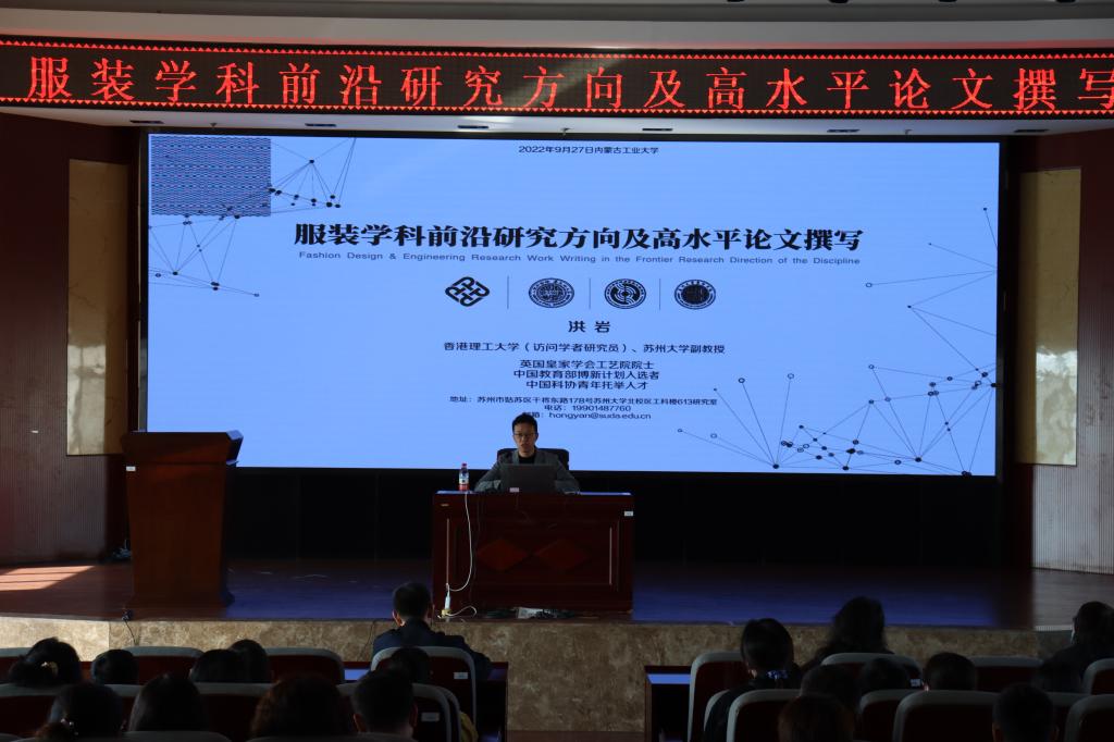 2022年9月27日9:00,beats365邀请英国皇家学会工艺院院士,中国科协青年托举人才,中国博士后国际交流计划引进人才,江苏省高校可持续纺织材料与工程国际合作联合实验室执行主任,香港理工大学研究员,苏州大学副教授、硕士研究生导师洪岩作题为“服装学科前沿研究方向及高水平论文撰写”的学术报告,beats365副院长麻文效主持会议,学院专业教师、研究生及部分本科生参加了此次报告。