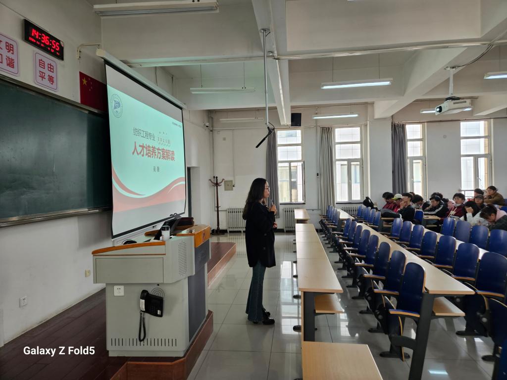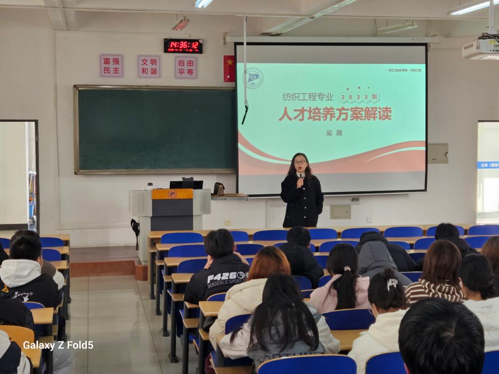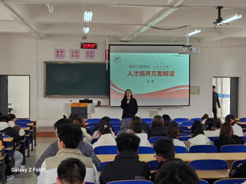 为帮助2024级学生充分了解专业的基本情况,人才培养要求和就业方向,更好地引导他们尽快融入大学生活,明确学习方向,制定学习计划,树立专业认同感,纺织工程系于11月14日下午在教A辅301举办了大一新生的专业认知教育。纺织工程系吴薇老师针对2023版人才培养方案进行了详细的讲解。本次讲解旨在为新生及在校学生全面剖析纺织工程专业的培养目标、课程设置、实践教学以及未来的职业发展路径。