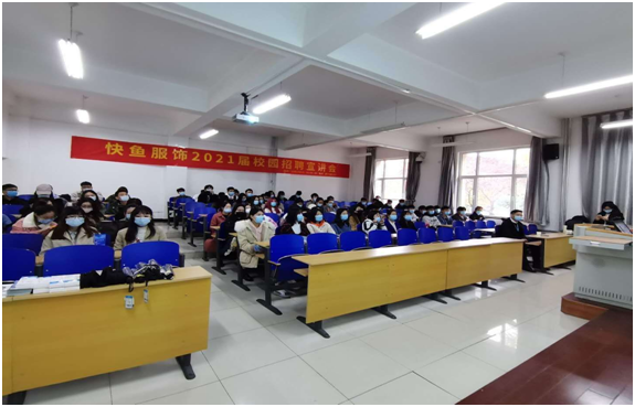 宣讲前,企业宣讲人向同学们介绍了企业历史及同行业优势。快鱼品牌成立于2003年,是一家以直营连锁为主的“快时尚”休闲服饰零售商;快鱼服饰以”国际流行时尚,国民平价消费”作为品牌的定位,赢得了消费群体的喜爱。经过十数年的快速发展,快鱼品牌店铺已经基本覆盖全国,目前门店数量达2500余家。同时公司秉承“为小鱼儿及其家乡做越来越多的公益慈善“的理念,成立快鱼爱心基金,资助大学生、建立希望小学等,把快鱼人的大爱传播到祖国的每一个角落。放眼未来,快鱼集团充满巨大的发展潜力。