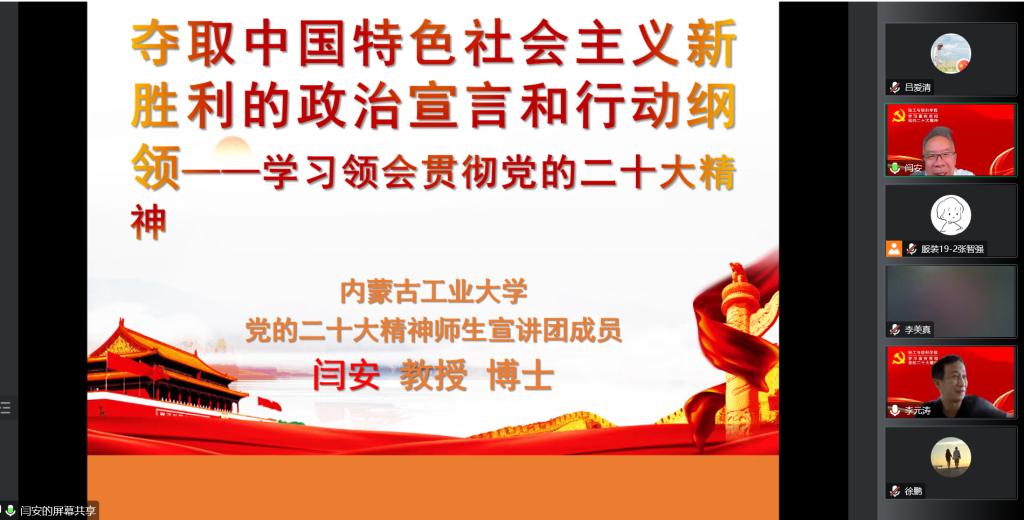 报告会上,闫安教授从“充分认识党的二十大的重大意义”、“全面准确学习领会党的二十大精神”、“全面学习、全面把握、全面落实推动党的二十大精神在内蒙古落地生根、开花结果”三个方面对党的二十大精神作了深入宣讲。报告聚焦党的二十大的重要意义、过去5年的工作和新时代10年的伟大变革、马克思主义中国化时代化、中国式现代化、坚持党的领导和全面从严治党、团结奋斗的时代要求等内容,对党的二十大精神进行了详细解读。宣讲报告主题鲜明、内容丰富、思想深刻,对全体参会人员全面准确学习领会党的二十大精神具有重要指导意义。
