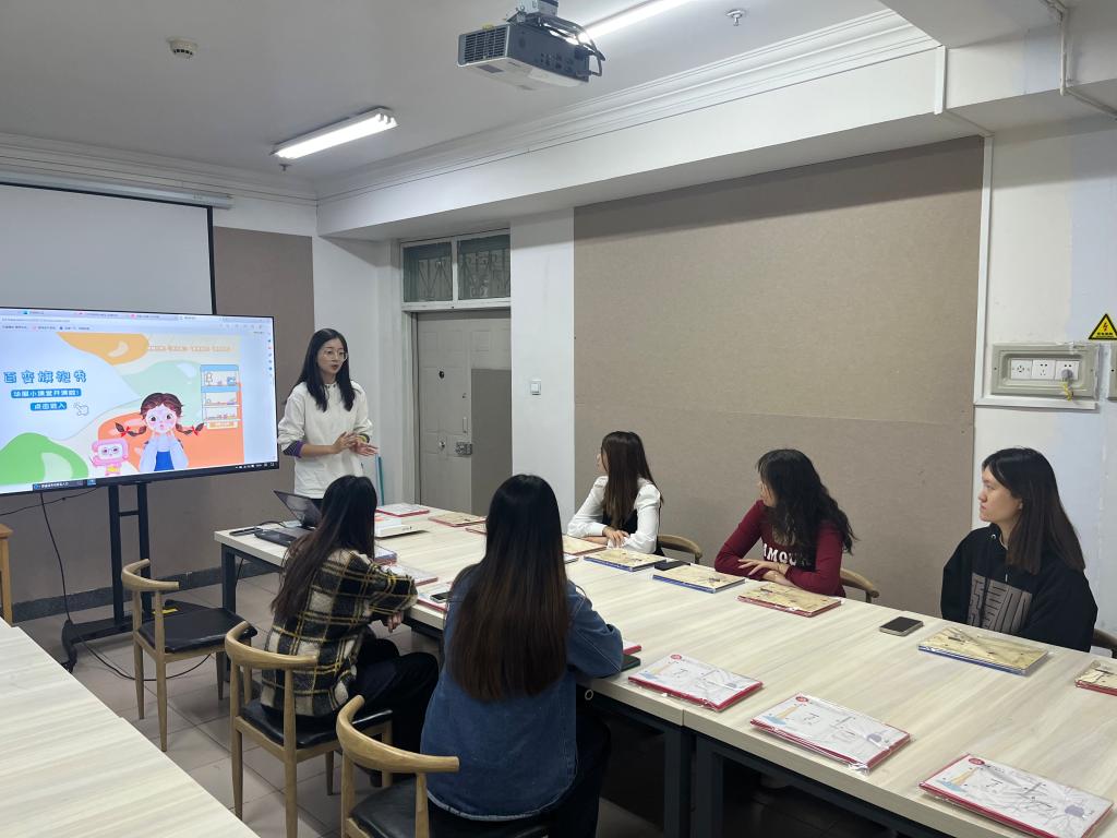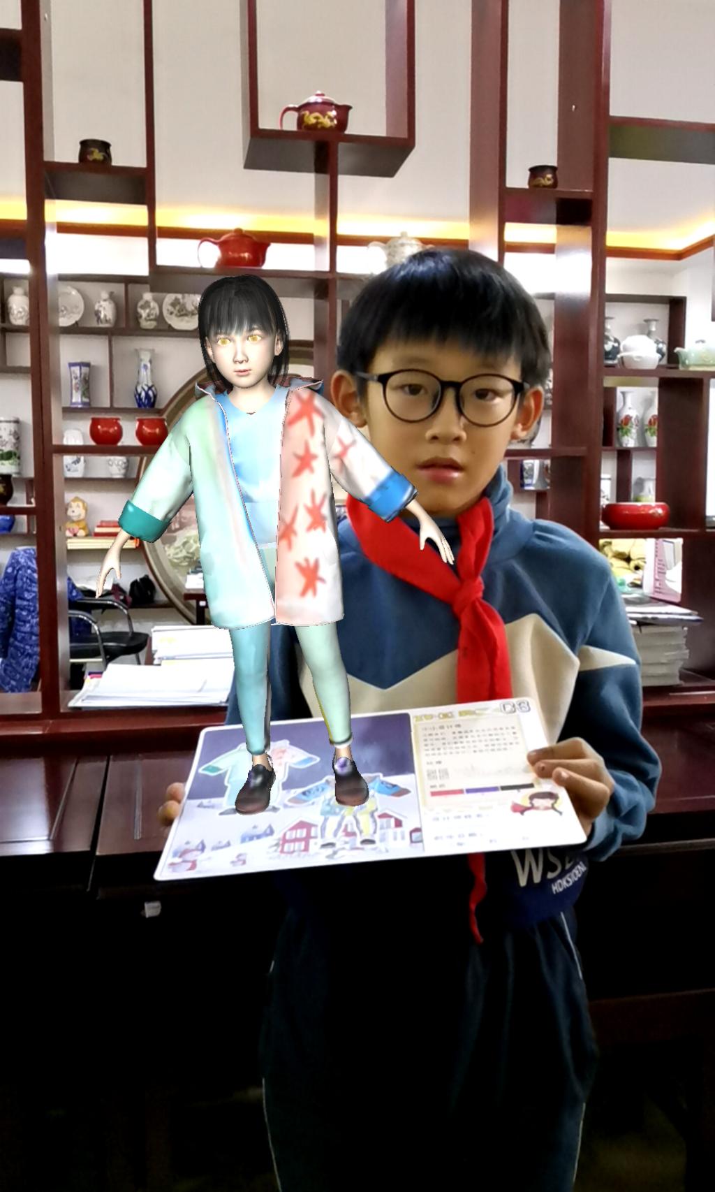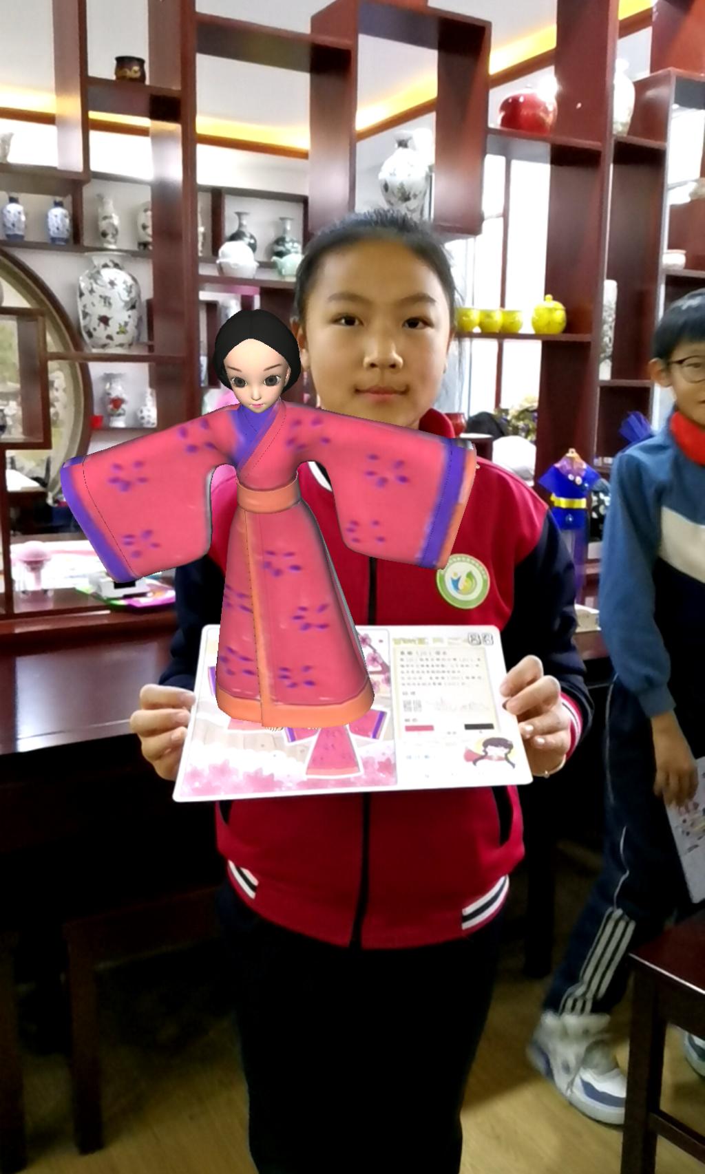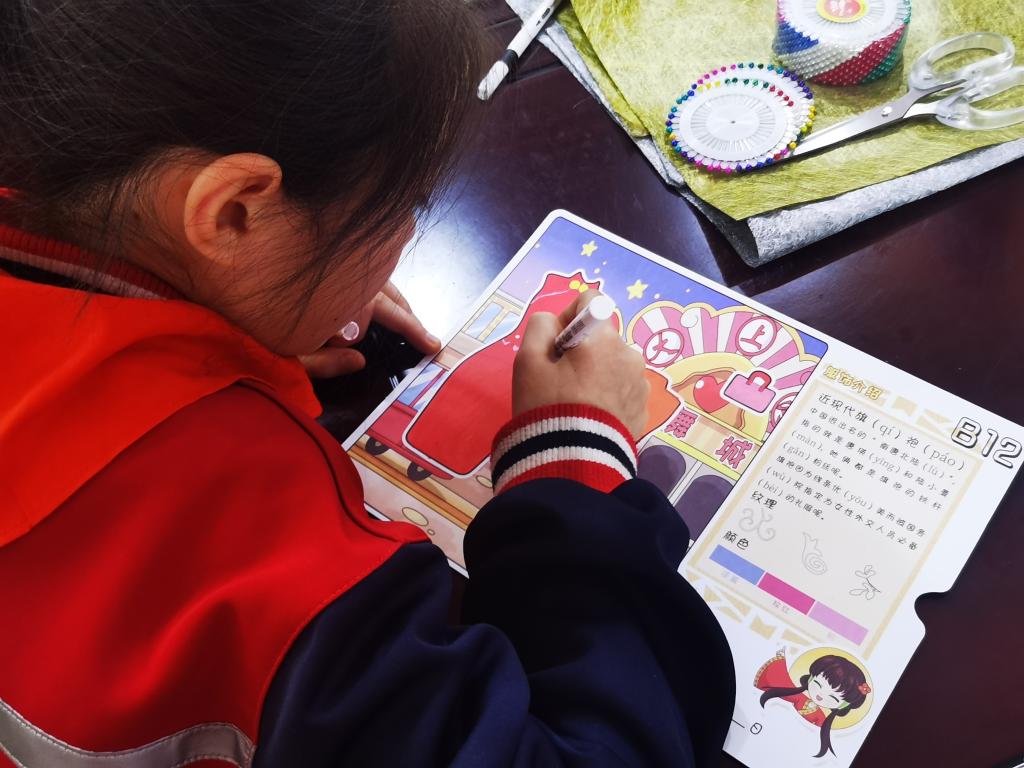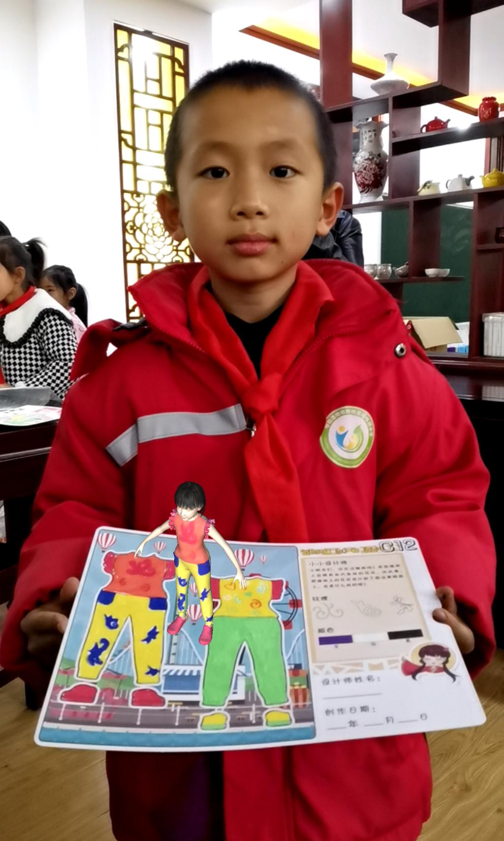 为了开发适合小员工的教学内容,美育团队师生课前进行了认真的备课和试讲。培训了6名服装专业本科生组成“华服文化推广小队”,在现场讲授并分组辅导。以校企联合研发的“华服小艺课堂”平台的线上、线下资源,为同学们导入“什么样的服装设计是美的”,引出服装设计三要素:色彩、造型、材质的知识点,通过对中华传统服饰“直裾深衣”AR卡片的色彩、图案设计体验,让同学们感受传统服饰的造型特点以及色彩、图案在服装设计中的视觉重要性。最后通过AR技术展示同学们的设计成果,让大家体验科学技术融入传统文化的效果和对创新性传承的重要作用。