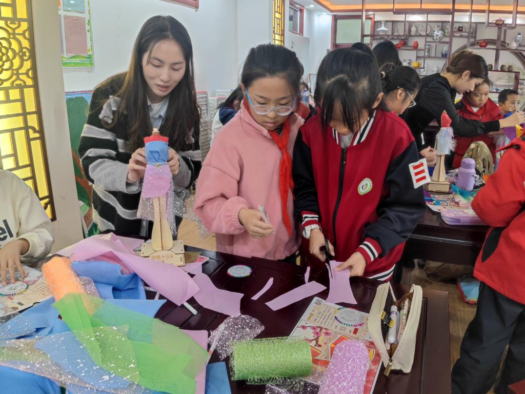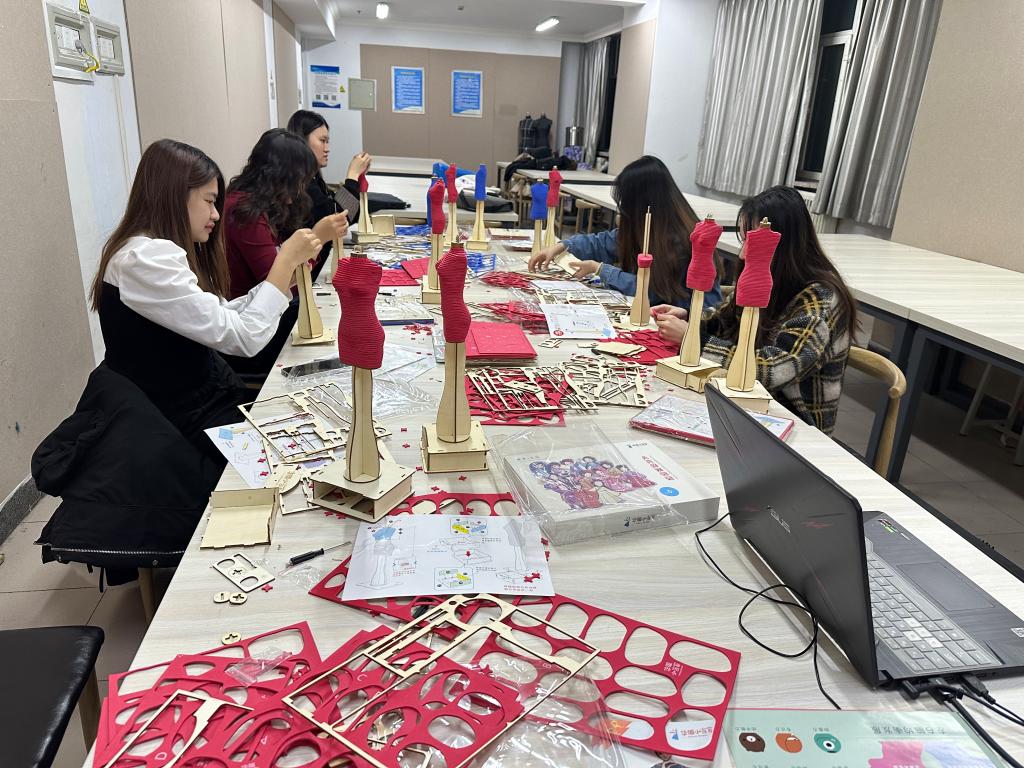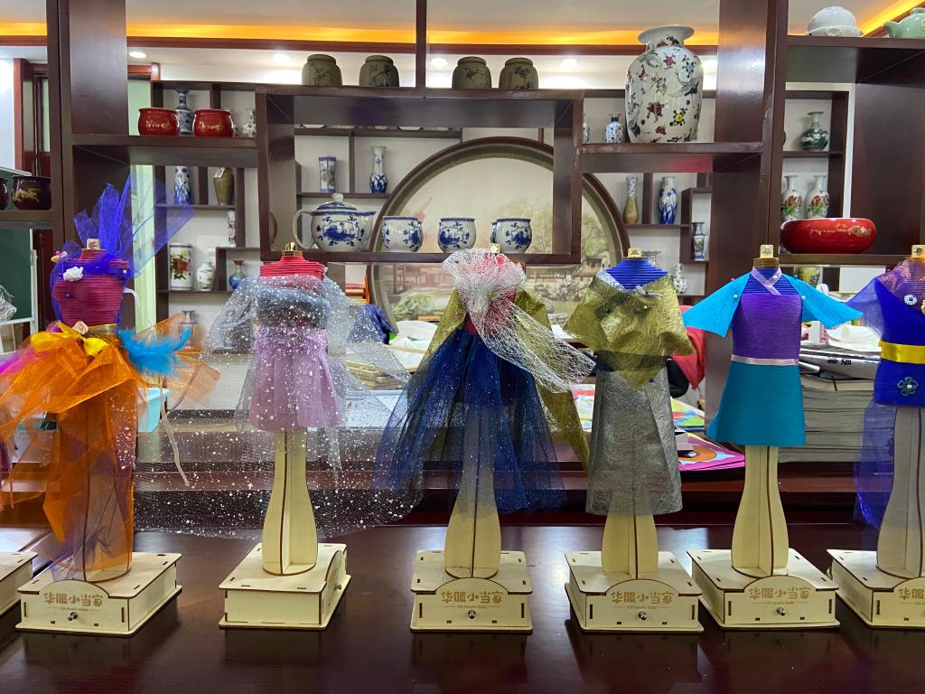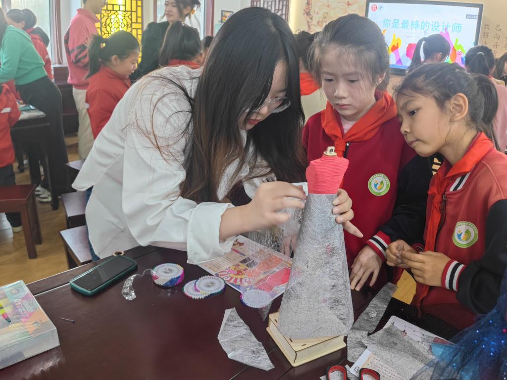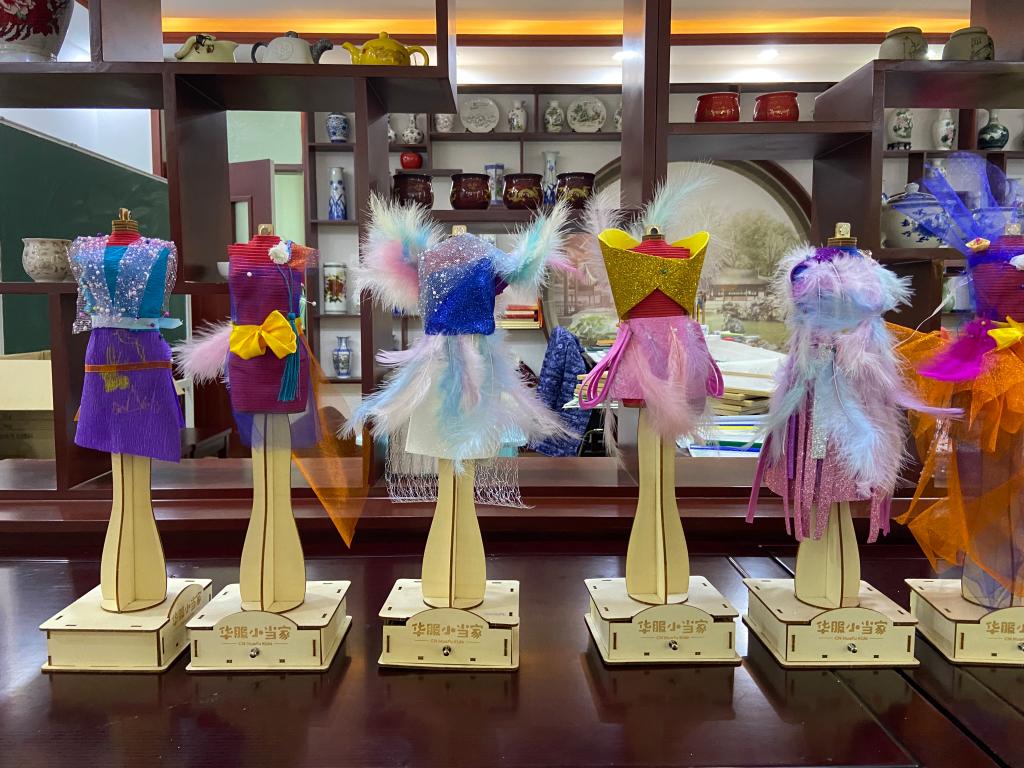 为了让同学们感受造型、材料在服装设计中的作用,课程开展了以不同材质为主题的系列服装设计制作,倡导同学们通过自己的双手来创造美。在“华服小当家”模特上选择自己喜欢的面辅材料构造天马行空的创意造型。以此来激发同学们的创意和创造力,实现“人人都是小小设计师”的育人效果。