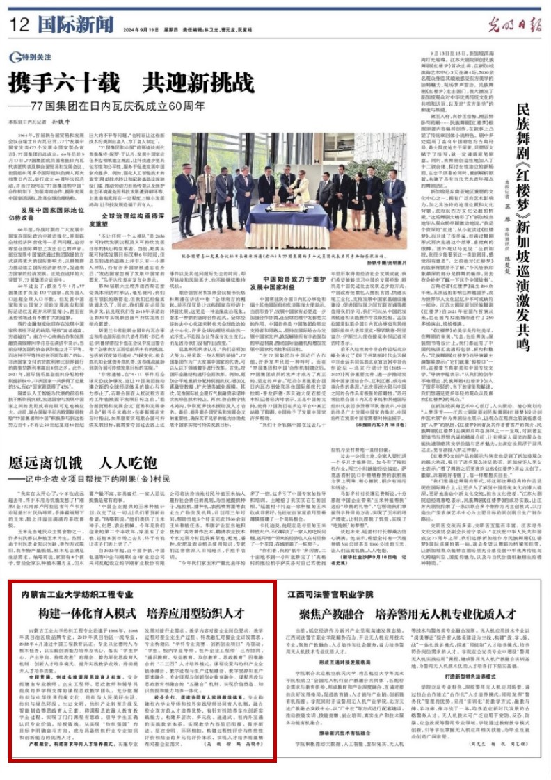 我院纺织工程专业人才培养聚焦自治区五大任务,服务国家重要农畜产品生产基地建设,面向区域经济发展特别是自治区羊绒产业高质量发展对人才培养的需求。9月19日《光明日报》刊发纺织工程专业“构建一体化育人模式 培养应用型纺织人才”文章。