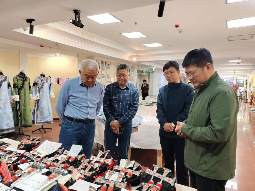 会后,理事长一行参观我院“服饰非物质文化遗产美育基地”、“石榴花开”铸牢中华民族共同体意识教育基地及美育教育实践基地,现场观摩了学生制作的蒙古族部落服饰作品及紧扣铸牢中华民族共同体意识主线的展陈内容设计。理事长对我院在人才培养中深耕地域文化底蕴、在教育实践中创新融合地方资源、在文创研发中赋能产业升级的办学模式表示高度认可。