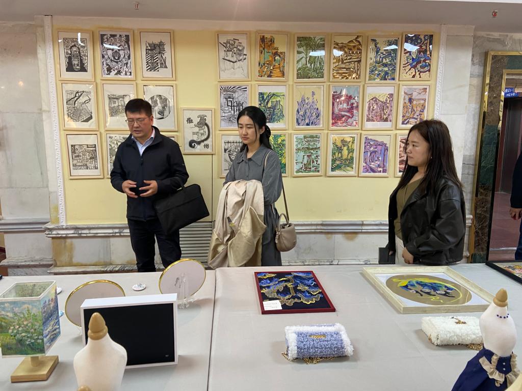 会后,白洁主任一行实地参观了学院服装服饰展厅和美育实践教育基地。展厅内陈列的民族服饰创新设计作品、美育课程作品及非遗传承人指导完成的蒙古袍、蒙古族手工艺刺绣、帽饰掐丝珐琅等工艺作品,生动展现了学院在民族技艺传承与科技应用领域的探索成果。在美育教育实践基地,基地负责人讲解了基地设计理念、实践教学功能区划分、美育课程体系及美育成果展示等规划。白洁主任对学院“以文化人、以美育人”的特色培养模式高度认可,并提出加强数字化传播、扩大社会辐射面的建议。